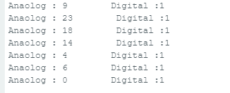 #define Dig_pin 7 int Ana_out = 0; void setup() { Serial.begin(9600); pinMode(Dig_pin, INPUT); } void loop() { int dig_out = digitalRead(Dig_pin); Ana_out = analogRead(A0); Serial.print("Anaolog : "); Serial.print(Ana_out); Serial.print(" Digital :"); Serial.println(dig_out); delay(500); }